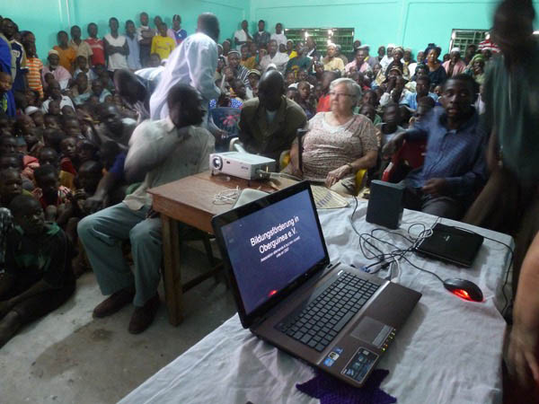 L’entreprise SAP nous a donné 6000 euros en décembre 2008. Complétée de 3850 euros de dons privés, cette somme nous a permis de commencer la construction. Les gens du village ont fabriqué les briques. J’en ai fait les plans, en particulier ceux de la salle de projection, une nouveauté sur place. Mohamed a apporté les 9850 euros avec les plans en hiver 2009 et a expliqué aux habitants comment procéder. À cette époque, il n'y avait pas de téléphone portable en Guinée et les communications régulières n'étaient pas possibles. Mamadi Kaba, notre responsable de projet, devait parcourir 60km à moto pour trouver un téléphone à Kankan.