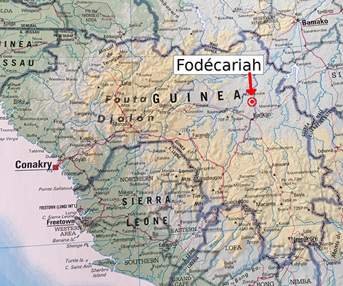 Le village guinéen de Fodécariah, où nos nombreux projets ont été réalisés, est situé à 60 km au nord de Kankan. Comme on peut voir sur la carte en haut à droite, c‘est située au nord-est du pays, directement sur le fleuve Milo, qui est un affluent du Niger.
