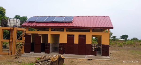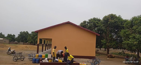 Bloc sanitaire avec 8 latrines et un château d’eau Pour obtenir le support ministériel regional de l´éducation (DPE de Kankan) cad l´assignation des professeurs, il faut que chaque école ait son puits de forage et des latrines. Nous avons fait mieux: