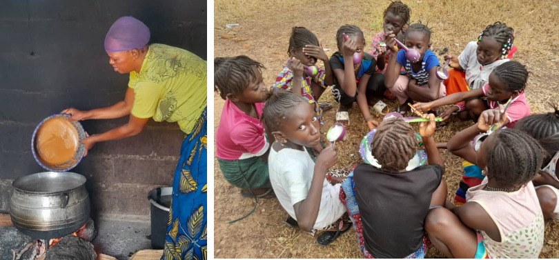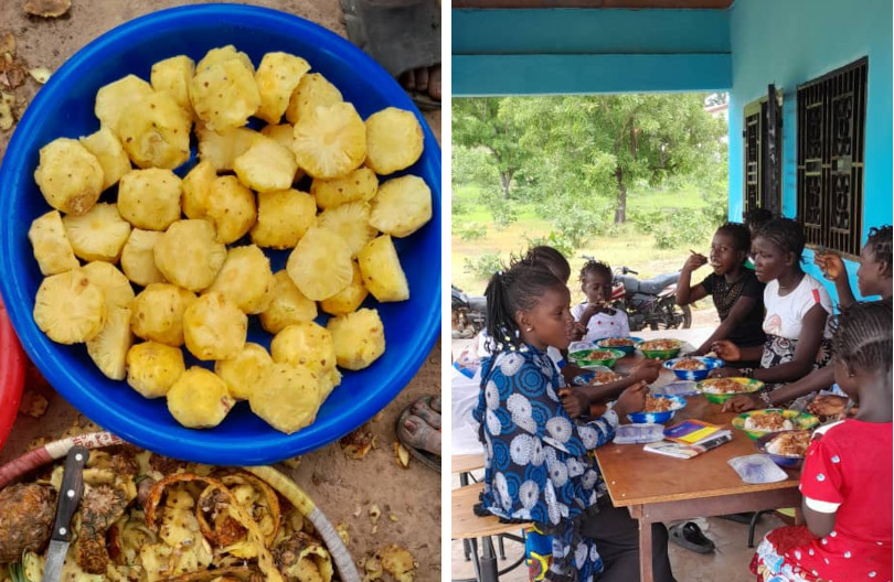 Auparavant, un sac de riz de 50 kg était acheté pour chaque enfant, et ce 2 à 3 fois par an. Maintenant, nous nous battons pour obtenir des sacs de riz pour plus de 50 filles en même temps. Cette année, nous avons donc acheté des haricots et de l'huile d'arachide en plus et réduit la quantité de riz. Nous pensons que c'est mieux dans la mesure où le riz est importé de Thaïlande, ce qui ne soutient pas les agriculteurs locaux, et parce que le régime alimentaire en Guinée est très unilatéral. La plupart des familles pauvres ne mangent jamais ou rarement de la viande, même les œufs sont chers. Il n'y a pas de vente de fromage ou de lait qui ne se conserve pas sans réfrigérateur. Ainsi, par le biais des haricots achetés, plus de protéines et de fer sont apportés aux repas.