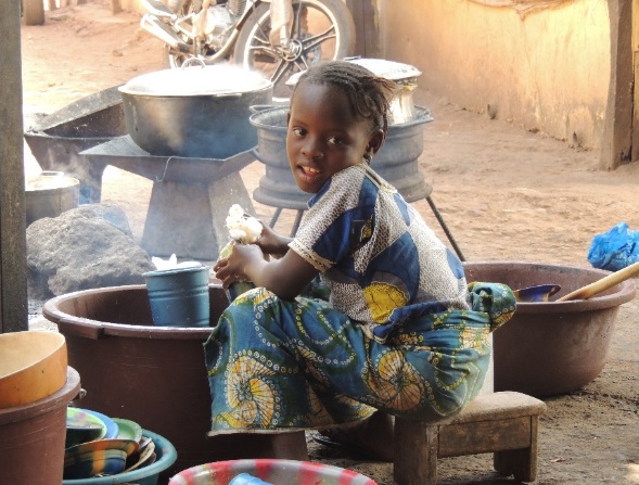 La cuisinière en action à préparer la sauce cacahuètes, une cuisinière qui fait de son mieux pour régaler les papilles en diversifiant les repas entre le riz, les pommes de terres, les haricots et surtout la distribution de fruits